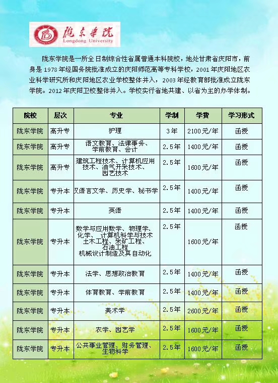 隴東學(xué)院位于甘肅慶陽市。是一所實(shí)行省地共建、以省為主的多科型全日制普通本科院校。學(xué)校是蘭州大學(xué)、華東師范大學(xué)等院校的合作院校,與美國北亞利桑那大學(xué)、洪堡州立大學(xué)、曼斯菲爾德大學(xué)及臺灣中國文化大學(xué)等13所院校建立了校際合作交流關(guān)系。