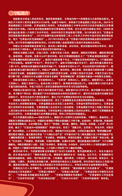 我院是經(jīng)甘肅省人民政府批準(zhǔn)、國家教育部備案、甘肅省內(nèi)唯一一所建筑類公辦高等職業(yè)院校。學(xué)院位于蘭州市七里河區(qū)晏家坪三村200號,始建于1958年,原隸屬于甘肅省建筑工程總公司。2001年甘肅省建筑職工工程學(xué)院、甘肅省建筑工程學(xué)校、甘肅省建筑職工中等專業(yè)學(xué)校三校合并組建成立甘肅建筑職業(yè)技術(shù)學(xué)院。2004年底學(xué)院整建制劃轉(zhuǎn)甘肅省建設(shè)廳管理,成為全民所有制事業(yè)學(xué)校,2008年底順利通過教育部人才培養(yǎng)工作水平評估,2009年移交甘肅省教育廳管理,2010年被批準(zhǔn)為“甘肅省示范性高職院校建設(shè)單位”,2013年底順利通過教育部第二輪人才培養(yǎng)工作評估和省示范校建設(shè)項目驗(yàn)收,現(xiàn)為“甘肅省示范性高職院校”。2017年6月成功入選“甘肅省13所優(yōu)質(zhì)高等職業(yè)院校培育學(xué)!毙辛。2017年榮獲國防教育特色學(xué)校。2018年學(xué)院入選教育部第三批現(xiàn)代學(xué)徒制試點(diǎn)單位。