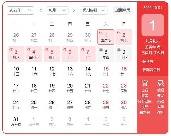 1、放假時(shí)間安排:10月1日(星期六)至7日(星期五)放假,共7天。10月8日(星期六)和10月9日(星期日)上班。