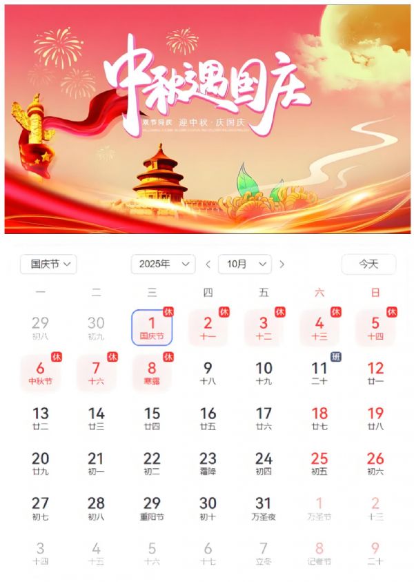 [10月1日-10月8日(放假調(diào)休),共八天。10月9日(星期四)正常上班。恭祝朋友們國慶中秋雙節(jié)快樂、生活喜樂、闔家幸福!